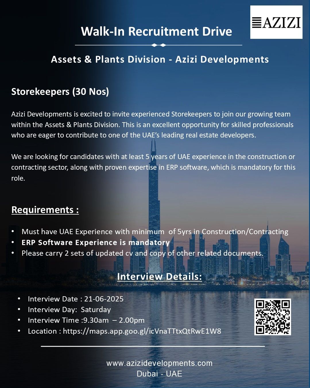 Jun 20, 2025 Walk-in Interviews in Dubai Today – Azizi Developments is Hiring! Looking to start or grow your career in the UAE construction industry? Don’t miss this exciting opportunity!